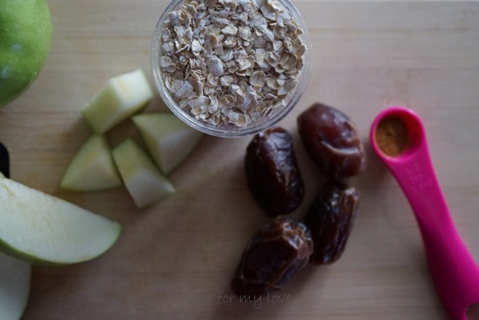 - In a blender jar, add the chopped apples, dates, oats, cinnamon and milk
