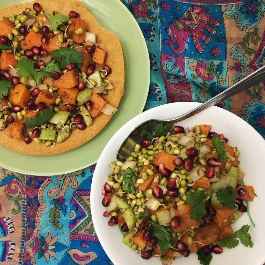If it were up to me, there would be sweet potatoes in everything. And because it is up to me in my kitchen, I use sweet potatoes wherever I can, such as in this salad. A sweet potato and green moong (mung beans) sprouts salad is a perfect salad bowl with the protein from the sprouts and the complex carbohydrates from the sweet potatoes. The pomegranates add a beautiful freshness to the salad. It is a simple, refreshing and healthy salad.