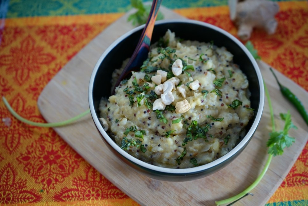 As someone who is not much of a rice eater, I have replaced the rice with quinoa, a more nutritious grain, and it beautifully complements the moong dal (petite yellow lentils), which are traditionally used in khichidis. It is a one-pot meal perfect for a quick weeknight dinner or a weekend lunch.