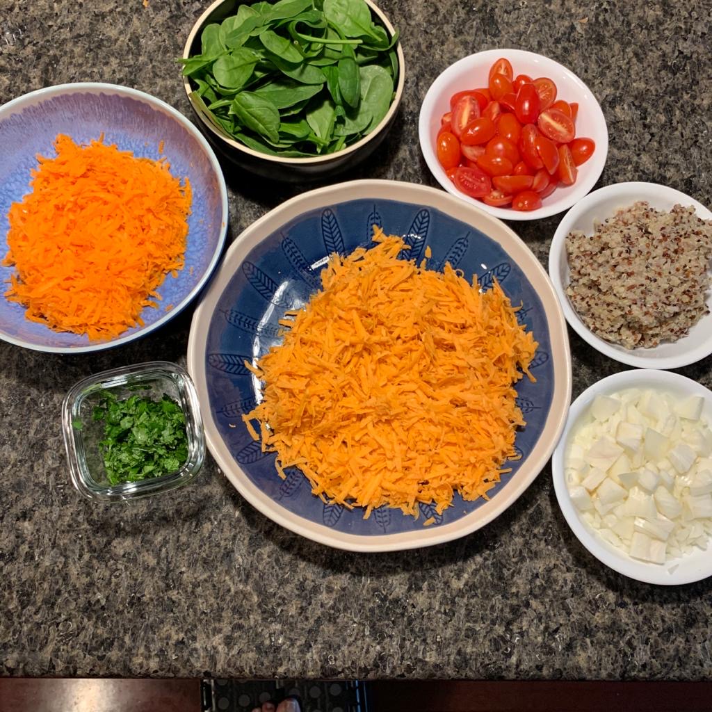 - In the meanwhile, begin shredding the sweet potatoes and carrots. If they are pre-shredded, great!. Chop up the onions and halve the cherry tomatoes. (Make sure to wash all the vegetables prior to chopping/shredding)