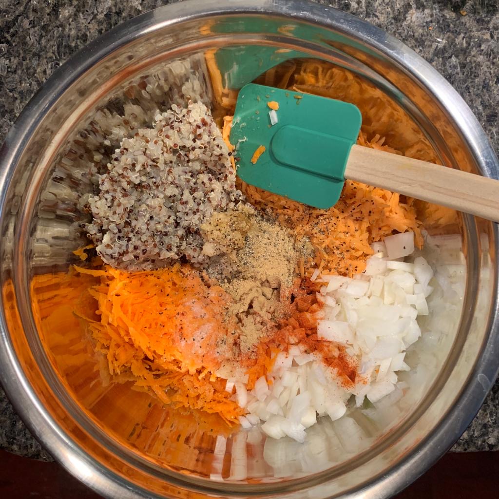 - In a mixing bowl, add the shredded vegetables, onions, spices & herbs, and the cooked quinoa. Also add the chickpea flour. Mix thoroughly
