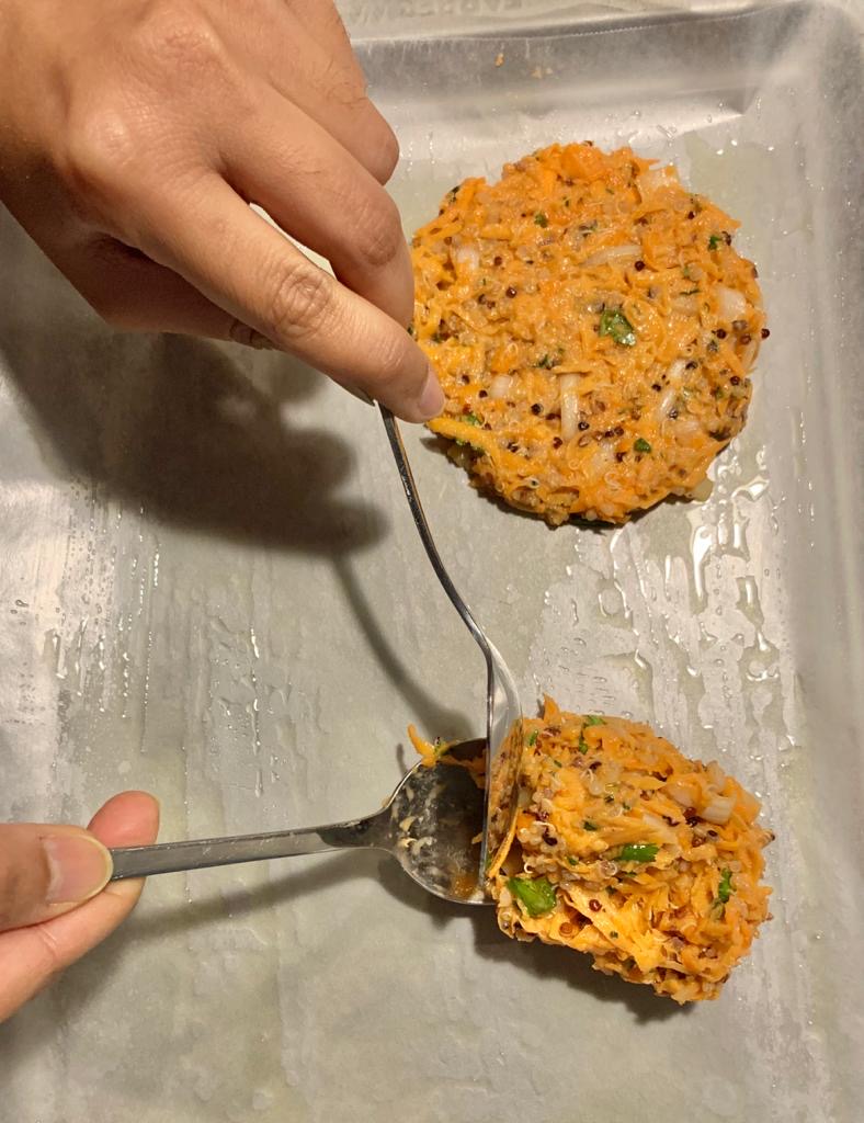 - Using a 1/4 cup measure, scoop the mixture onto the lined tray. Using 2 spoons, flatten the cake (don’t apply too much pressure and make it thin, maintain at least a 1/4″ thickness to the cake) and maintain its round shape. Drizzle some olive oil over the cakes