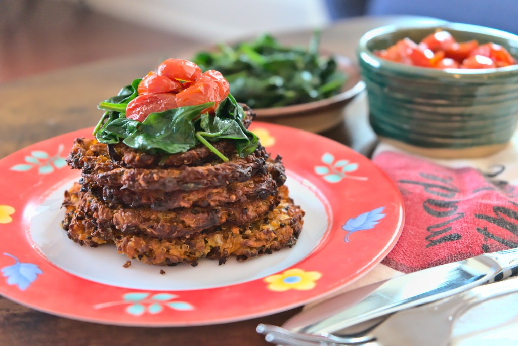 - To assemble the cakes, place them on a plate (feel free to stack them like pancakes). Top with the spinach and chilli garlicky tomatoes