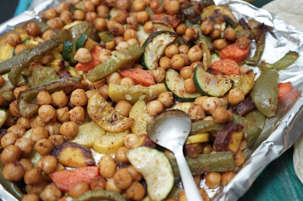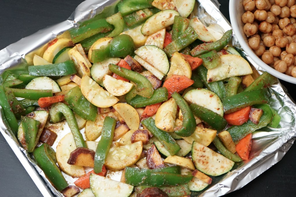 - In a large mixing bowl, add all the vegetables, chickpeas, and olive oil. Then add, 1/2 tbsp garlic powder, chilli, cumin, coriander and cinnamon powders and mix well until every piece is coated well. Add salt and mix again
