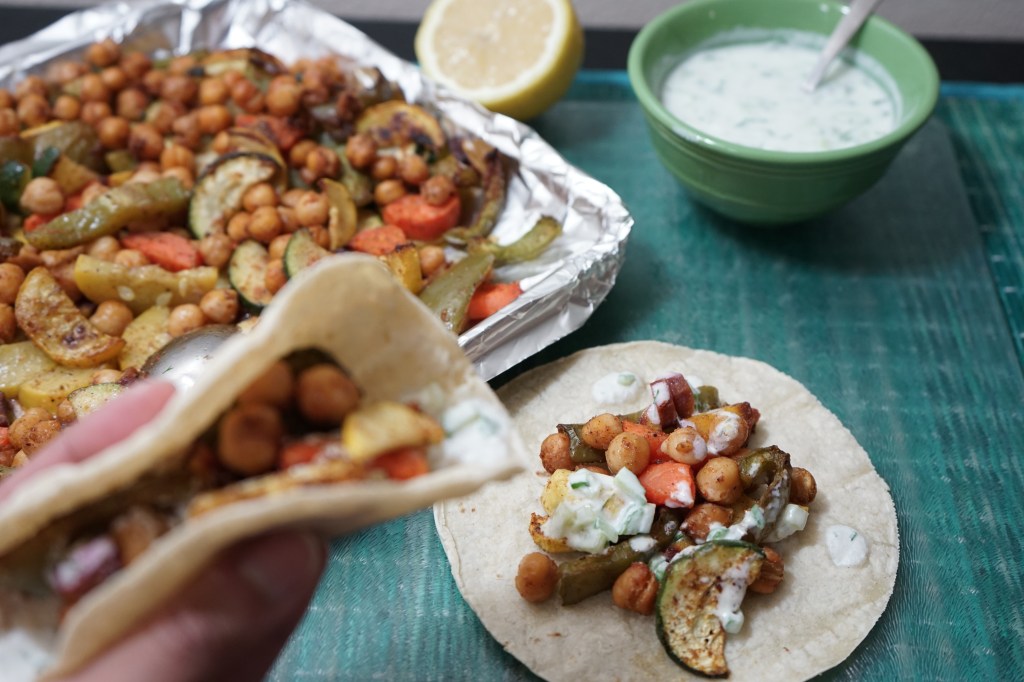 - Once the vegetables are roasted and out of oven, load them up on the tortillas. Top with some Tzatziki sauce and enjoy the fajitas