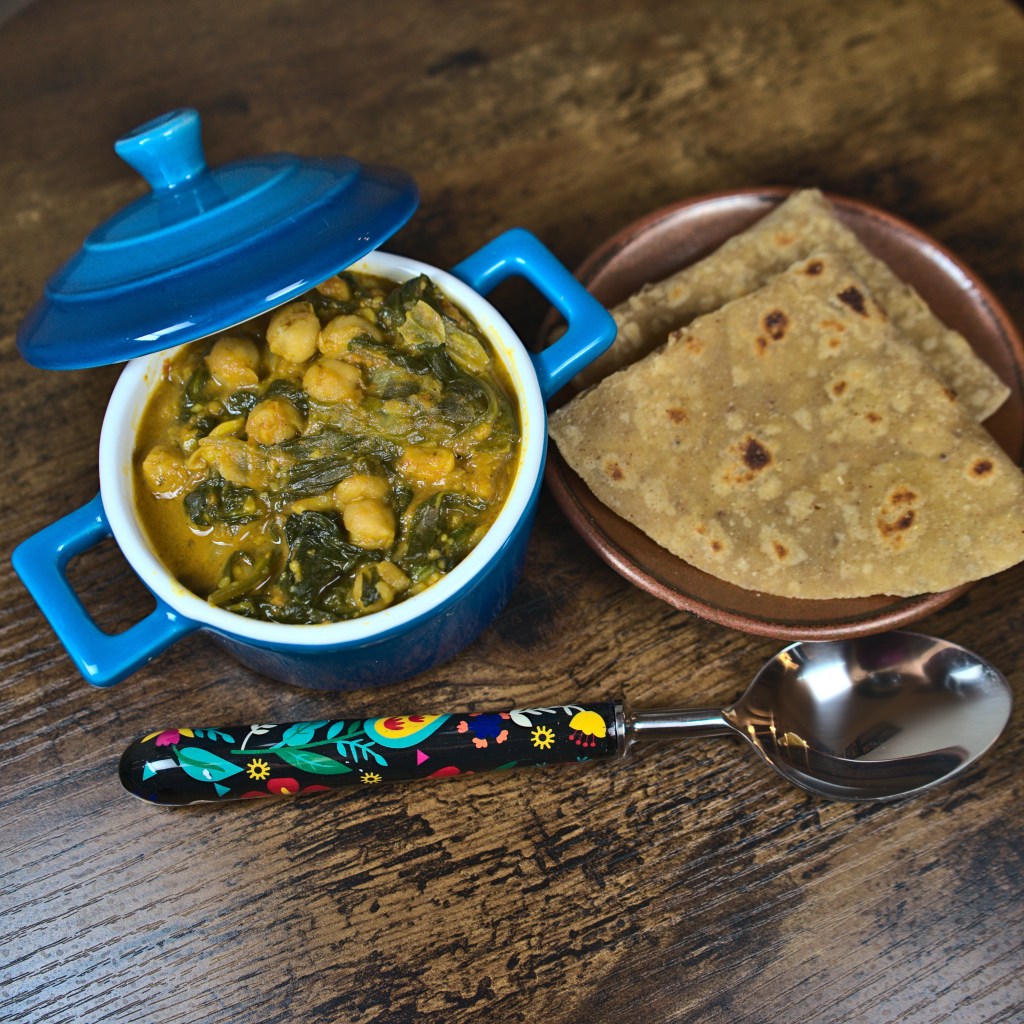 My husband loves Chole, but getting him to eat leafy greens is just as hard as getting children to eat their greens. So I usually buy a huge bag of triple washed greens, Palak in this case, and leave it in the refrigerator so he can throw a handful of it in whatever he is cooking. When we are away on long-distance, Chole is one of his quick, go-to recipes, so convincing him to throw in some Palak was not hard. He thoroughly enjoyed it. So yayy! ๐Ÿ™‚