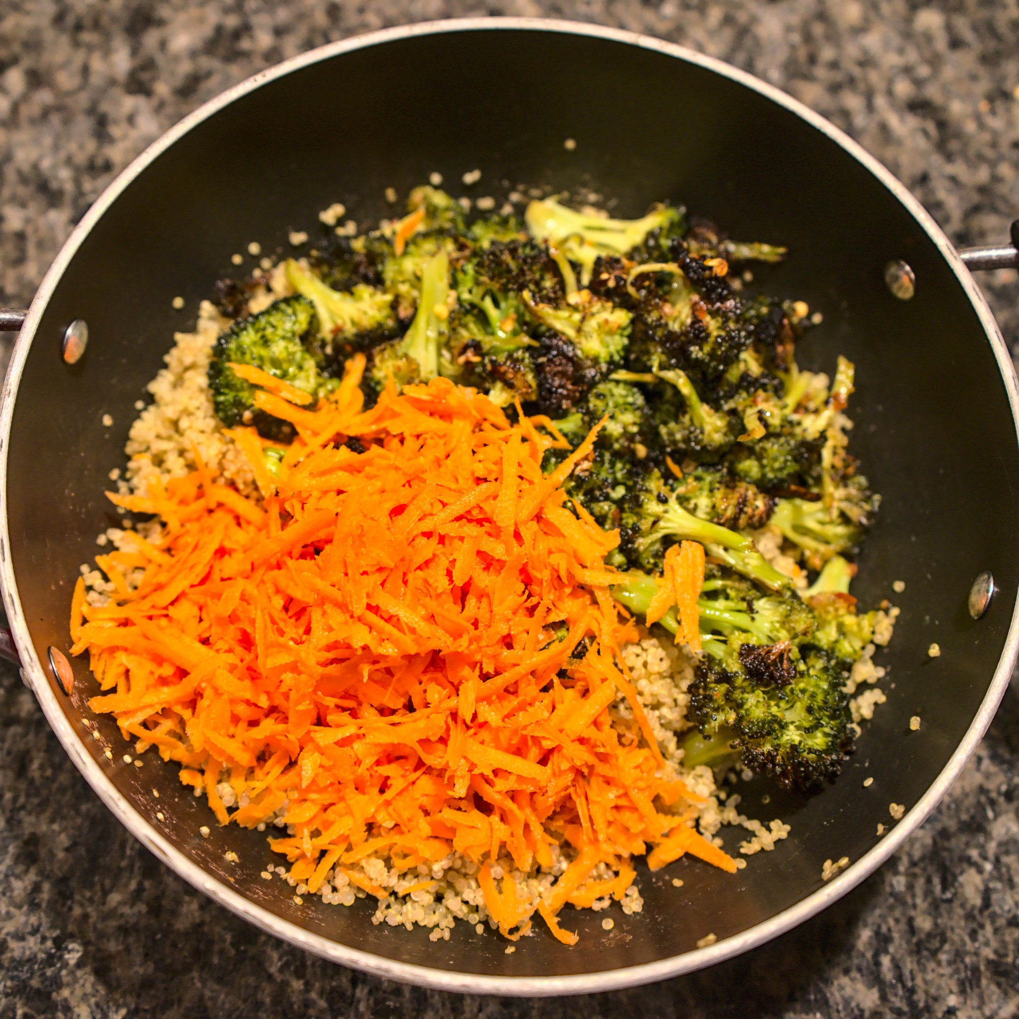 - To the mixing bowl with quinoa, add the roasted broccoli, shredded carrots and basil pesto. Mix well to coat all components with the pesto