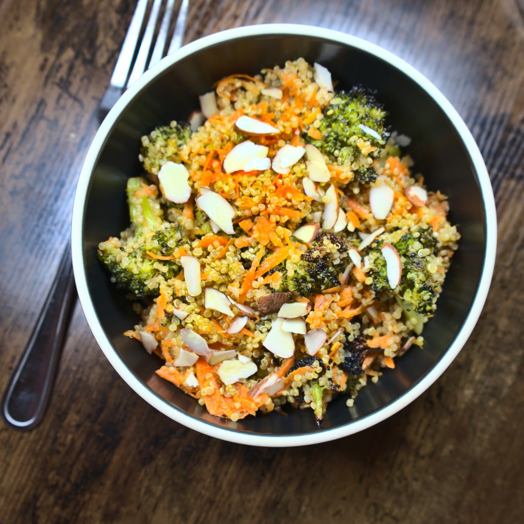 This salad works as a side or as an entree sized one. It can also be a great make-ahead salad or prepared and consumed fresh. I am a big fan of cruciferous vegetables like Broccoli. I particularly enjoy them in a roasted fashion. So, I always have bag of frozen ones in my freezer (although I have used fresh florets here). The combination is great because of the earthy, nutty flavors of the Quinoa together with the charred flavor of the roasted Broccoli and the crispiness of the toasted Almonds. The salad makes for a balanced meal with protein from the Quinoa, vitamins and minerals from the Broccoli and additional nutrients from the Almond.