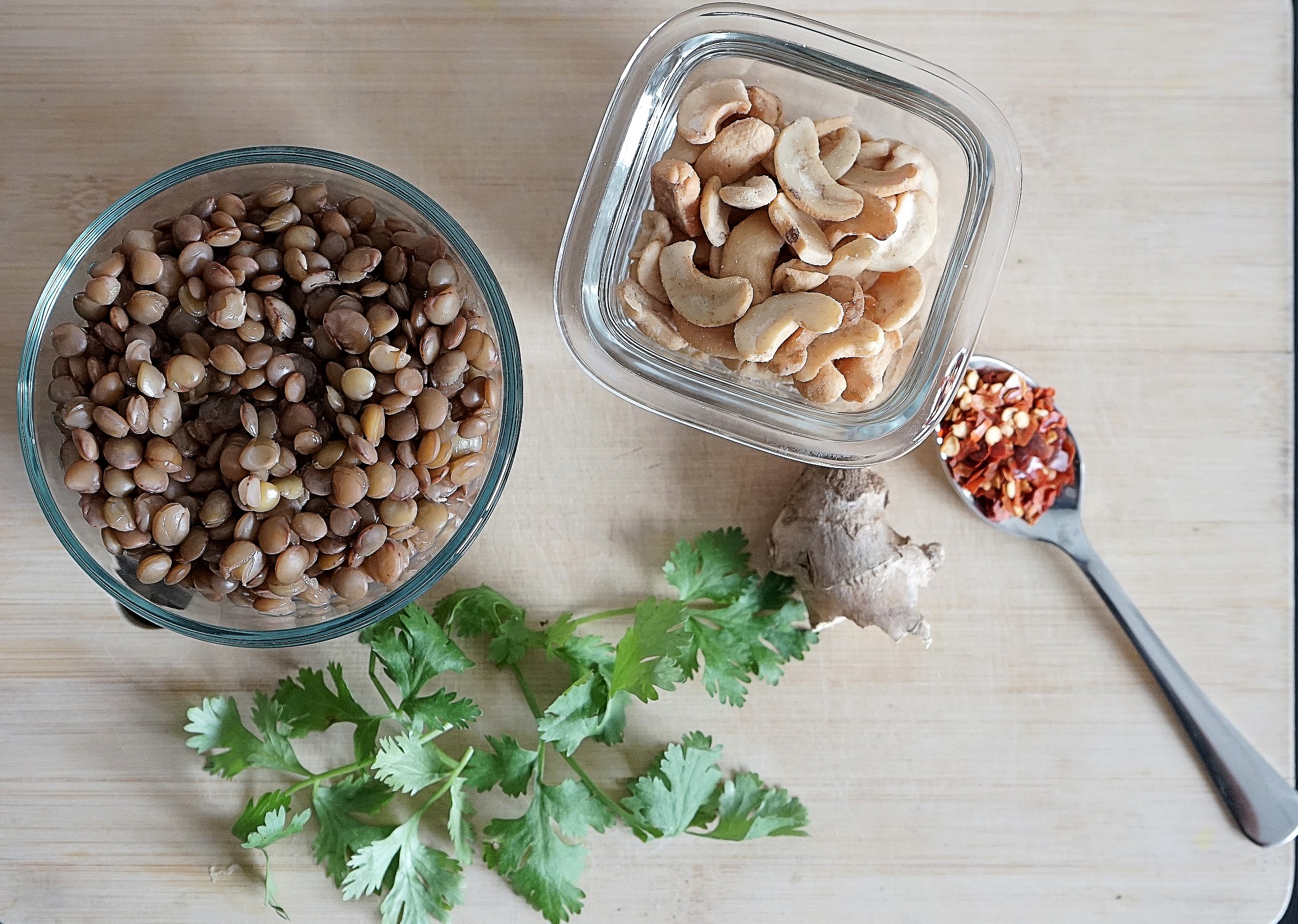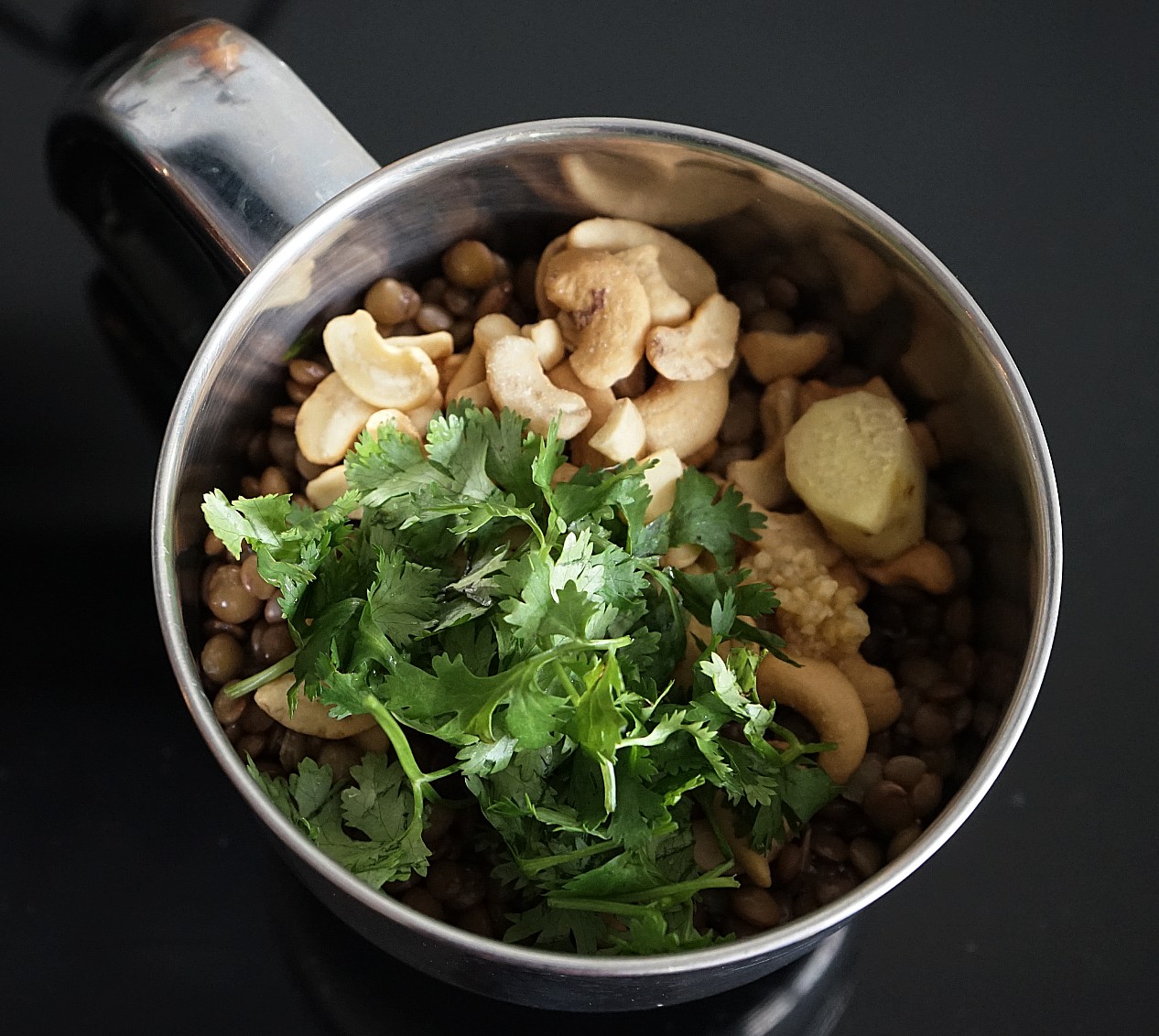 This recipe uses brown lentils. In general, lentils are amazing sources of plant-based protein and fiber. And this recipe gives you another way to eat lentils, other than the regular dal-chawal. This recipe also uses cashews, which also have great protein content along with beneficial mono-unsaturated fats and several beneficial minerals.
